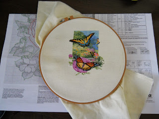 For those of you that don't remember what it looked like when I last worked on it over the summer, I finished the bottom butterfly, the rose it is resting on, and all the random green around the bottom and to the right (it will be something eventually, I promise).